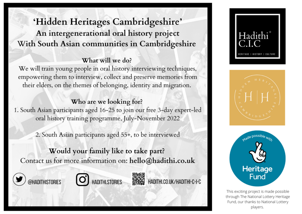 Having spent nearly ten years in academia thinking about these ideas, now, I am interested in helping others explore their South Asian heritage in Cambridgeshire. Through the generous support of the National Lottery Heritage Fund, and with the social enterprise Hadithi C.I.C, I am leading a new project called Hidden Heritages Cambridgeshire: Cross-generational connections through memories.