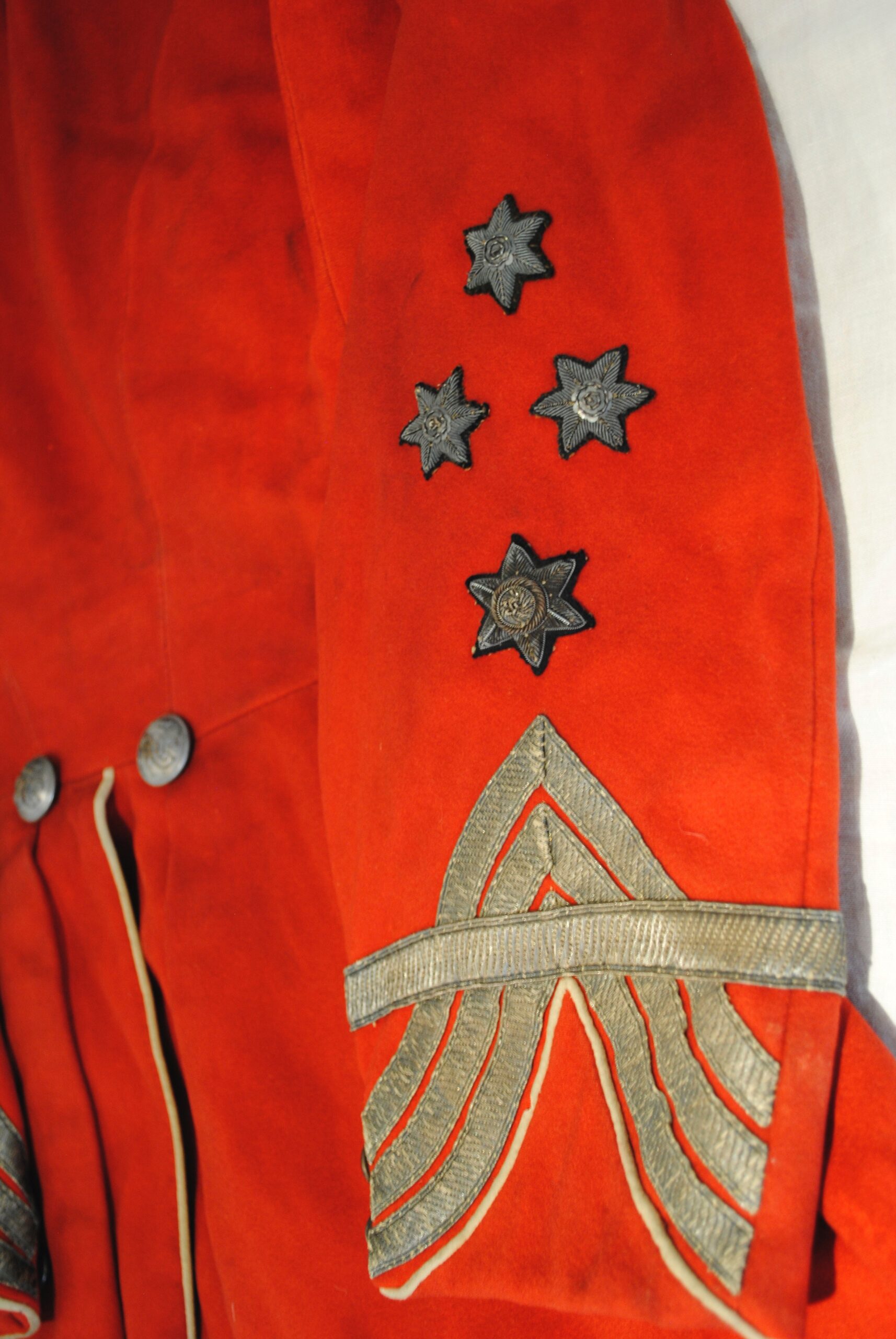 At first sight, the jacket is a fairly ordinary pillar box red wool, lined, man’s military uniform coat, very typical of Army uniforms pre-WWI. The three silver metallic braid stripes suggest that the owner was an Army Sergeant. However, the line through the stripes on the right- hand sleeve and 4 stars above, together with the intertwined M.V.I. on the buttons, suggest otherwise. The first clues are given by the inner handwritten labels which say S H Rowley, Histon. Additionally, the helmet label says ‘D Troop’, which suggests a mounted regiment.