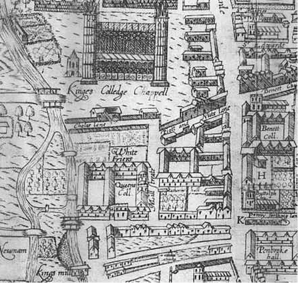 Richard Lyne’s 1574 map of Cambridge is the earliest that survives. Mill (Milne) Street is clearly marked north and south of King’s College. The central section of Milne Street disappeared when the King’s College site was developed in the 16th century. The riverside area here was transformed; at the time of Susanna Gregory’s novels it would have been the most populous part of Cambridge with docks, warehouses, and tiny houses. So busy that the debris produced in medieval times increased the ground level by two metres, according to Alison Taylor in ‘Cambridge: The Hidden History.’
