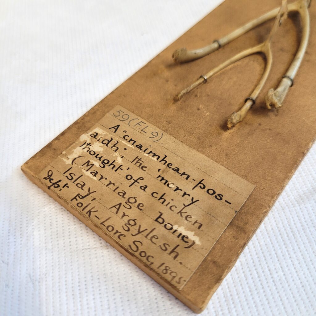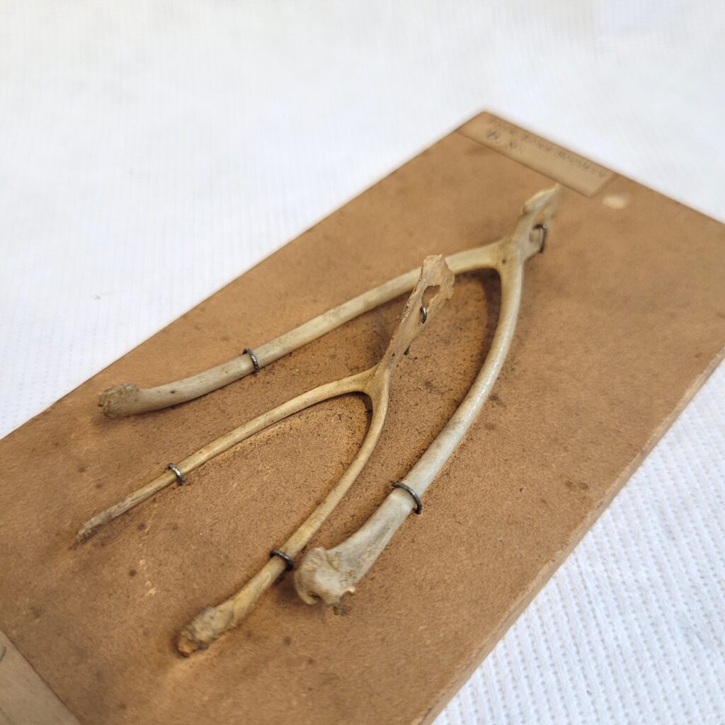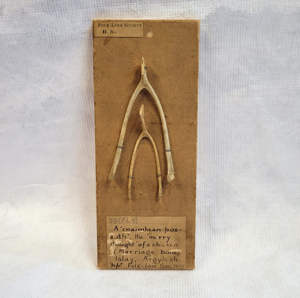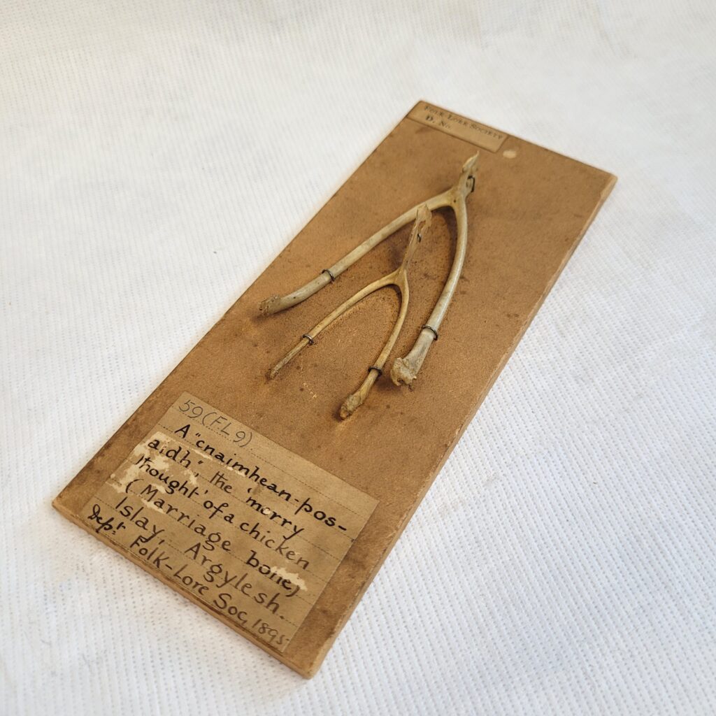 I have a HUGE personal interest in folklore, and discovering a whole collection within one of our spaces devoted to folklore objects was enough to make my heart soar! One of the objects I loved was two furcula chicken bones, mounted delicately onto a piece of wood. Or as you and I might know them better as, wish bones. Typically to make a wish on the wish bone, you would get the furcula of a chicken, turkey, or duck, wait for it to try and become brittle, then two people would hook their pinkies around either end and pull. Whichever lucky individual was left with the larger side, their wish was destined to become true! Legend has it that the superstition of wish bones began through the Romans. As chickens were scarce, so were the wishes which came with the wishbone. It is also quite common to find people wearing a wishbone as jewellery or carrying them as good luck charms, like one would perhaps keep hold of a rabbit’s foot or four-leaf clover.