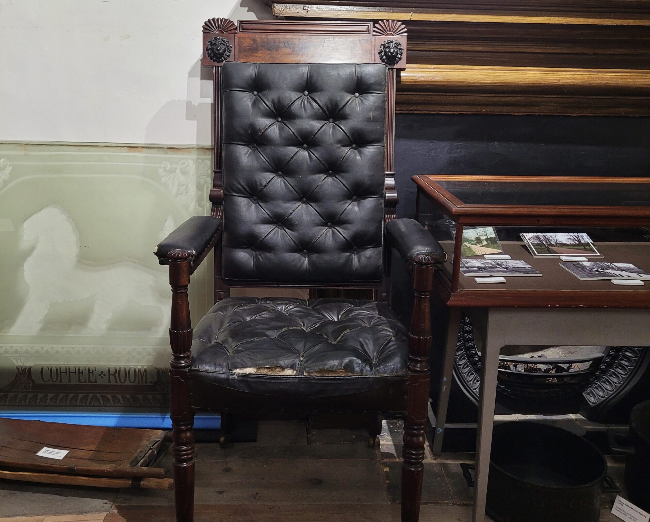The Mayor’s Chair was used by Cambridge mayors throughout the 18th century. It was hand-crafted by local artisans and is a beautifully skilled and well-made object. The frame is mahogany, and the seat and back are made from hand-stitched leather, with the details in the arms and head being made all by hand.