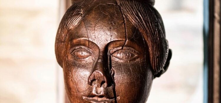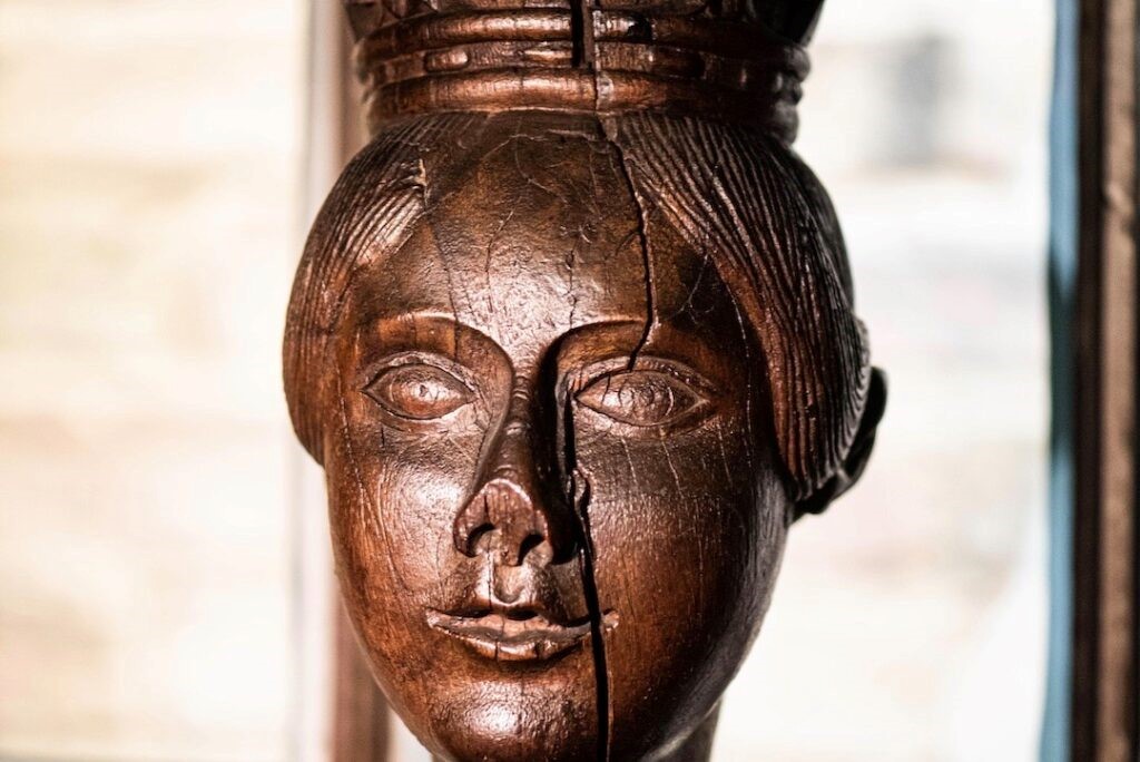 As you go up the stairs from the 18th century kitchen at the Museum of Cambridge, you enter a small room that was probably one of the guest rooms at the White Horse Inn. A miscellany of objects, portraits and maps awaits you but perhaps the most prominent object is the beautiful wooden bust on the left, a woman’s head with a crown. In her article on Boat Building,[1] Enid Porter, curator of the museum at the time, refers to this bust of Queen Victoria. It was attached to the horse-drawn pleasure cruiser that took people along the Cam on their excursions to Ely and Clayhithe. The boat was owned by riverside company Fosters.[2]