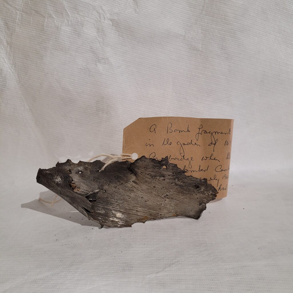 It is remarkable that this fragment survived the war, as it would be quite challenging to identify what you are looking at if you found it on the street or in your backyard. Moreover, for many, thinking about keeping this piece of metal would perhaps not be the first thought that comes to mind if they picked it up. Whilst the bombing on places like Vicarage Terrace and Mill Road bridge will not be forgotten, this small bomb fragment allows the Museum of Cambridge to tell the story of wartime in Cambridge visually.