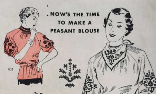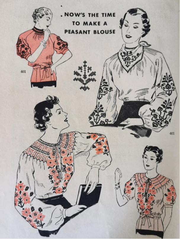An August 1936 copy of the magazine found in Constance’s papers shows that the inter war style was very similar to the fashion of summer 2025 with the “strong shoulders look” embodied in the “jacket frock” to be worn over a dress. Just like this year, the peasant blouse, inspired by Eastern European traditional costumes, was also in vogue then. “Now’s the time to make a peasant blouse”, “alive with bright colours in the cross-stitch flowers and deep smocked top,” write the editors of the 1936 magazine. The blouses sketched in the magazine resemble Hungarian traditional blouses and probably reflect the fashion input of the Hungarian Jewish tailors and dressmakers that took refuge in England between the two wars, following the rise of antisemitic policies in Hungary. This summer the bohemian peasant blouse is making a come back, probably under the influence of Ukrainian traditional costume and its beautiful embroideries.
