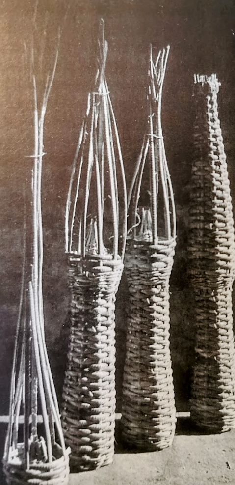 These hives were once used by the Metcalfe family of Holywell in the Fens, a family of rush-cutters, eel hive-makers and eel-catchers. Tom Metcalfe Arnold who died in 1994 was the last to make such a living on the river Great Ouse in Holywell.