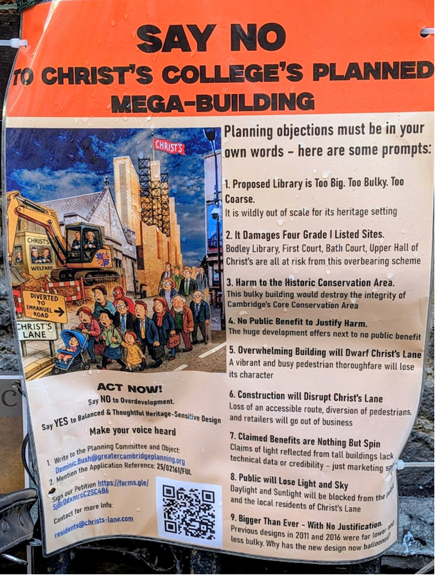 The dominant architecture of the colleges remains a subject of tensions between Town and Gown. In 2025 townspeople launched a campaign against the proposal by Christ’s College to build a new library alongside Christ’s Lane, a relatively narrow lane used by locals to reach the Drummer Street bus station and the Grafton shopping centre. Protesters have described the new proposed library as an overbearing building, out of scales and “fortress like”. They also object to the college blocking part of Christ’s Lane during the construction work. The college’s main argument in defence of the project is centred around the concept of “accessibility” of the building for the less mobile members of its community. The townspeople’s argument is that of accessibility for locals to the north of the city.