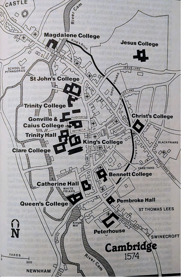 Richard Lyne’s map of Cambridge in 1574 shows how the town’s space was reorganised after the settlement of the University colleges. Commenting on this map Rowland Parker writes: