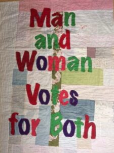 My other piece is a Suffrage Banner which was made to celebrate the 100 year anniversary of women’s suffrage in 2018. It serves as a happy reminder of a suffrage play that we put on in Newnham College. The banner is a piece of ultimate recycling as my appliqué letters are stitched on to a recycled 20th quilt which in turn had recycled a 19th century quilt!