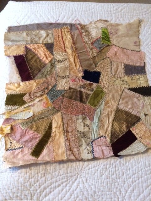 Sometimes, you find pieces in strange situations; this section of crazy patchwork was uncovered when I was sorting my mother’s house. I knew that she had a lace pillow and made lace but had stopped when I was about five years old. My father had made the lace pillow and covered it with tartan, as befits a Scot, but I had no idea of where the cover, the Crazy patchwork, originated.