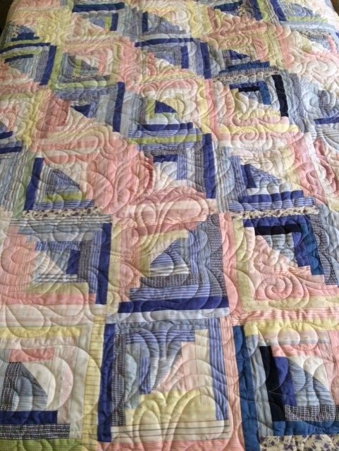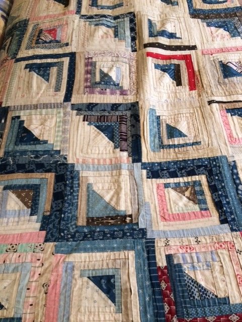 In the 1990s I saw this 19th century Manx log cabin on show in an antique shop in Cambridge and after some bargaining got the price down to something that I could afford. Later on that year a friend gave me a bag full of fabrics which toned and I decided to make my own version to have a pair of quilts for our spare bedroom. Do look for the deliberate pattern mistake to show that I am human. Note too, the quilting done by machine which was also an error!