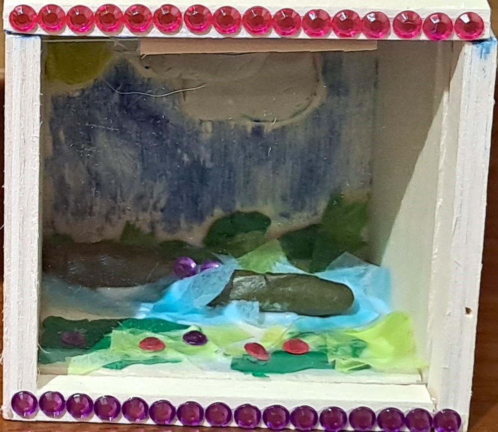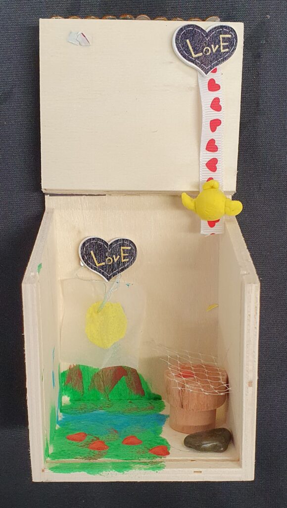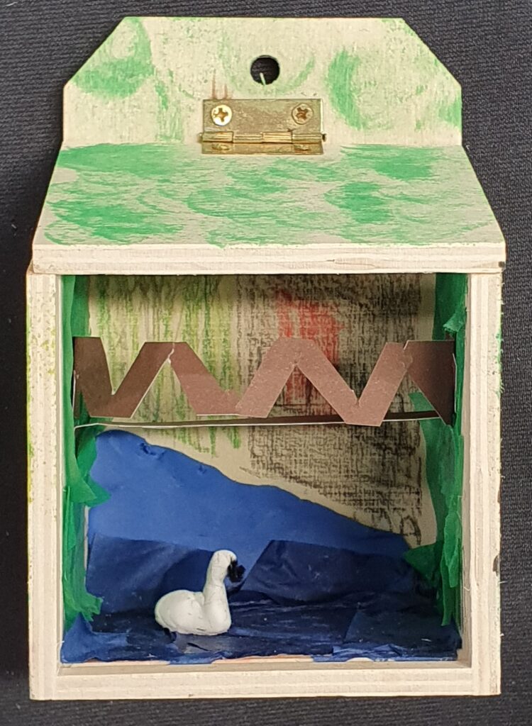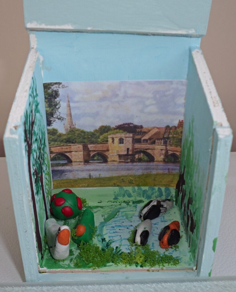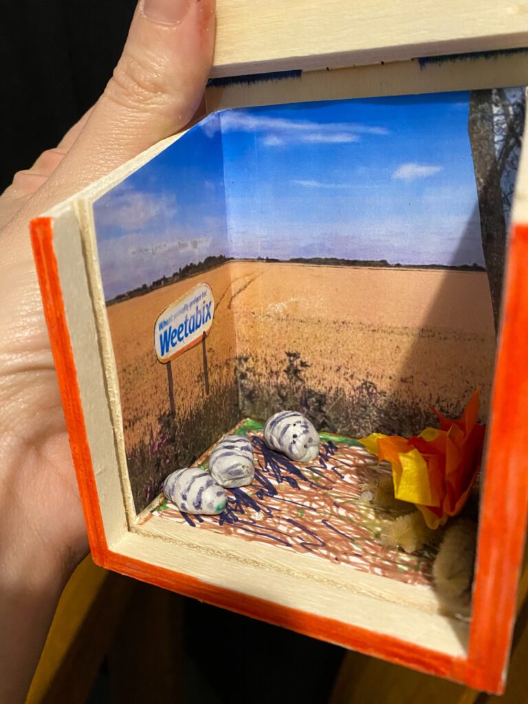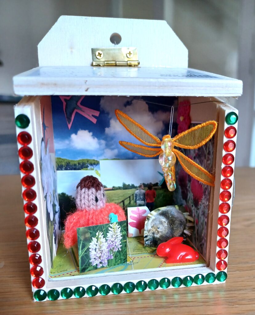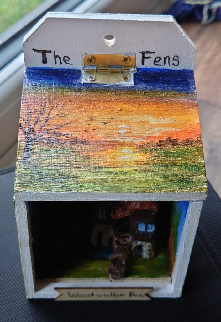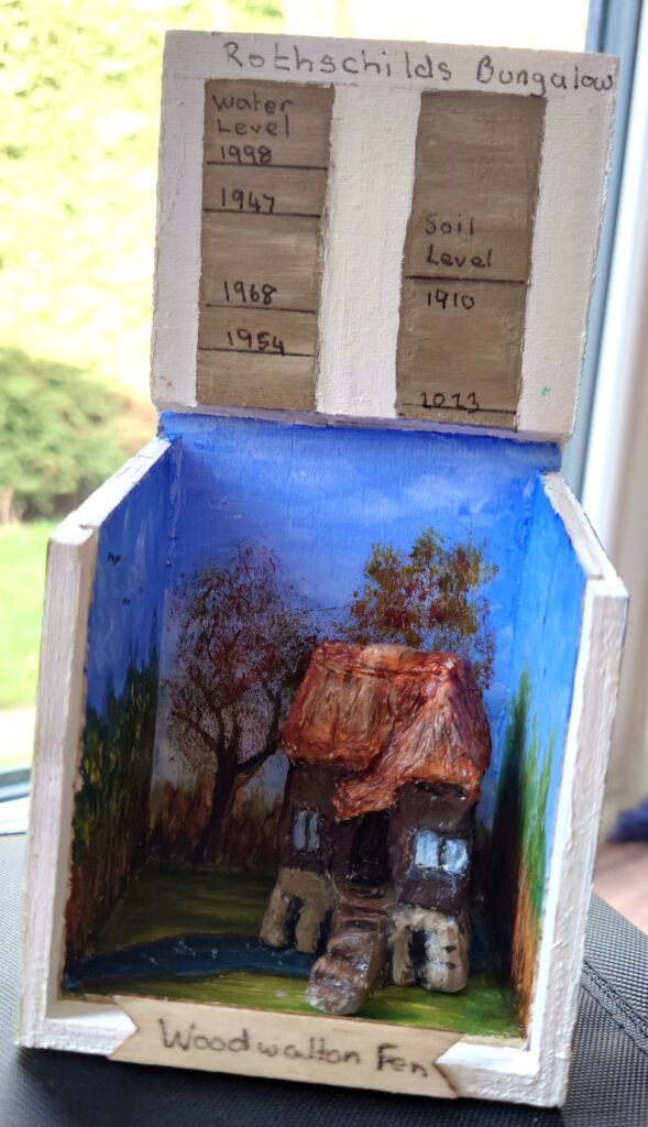 “I chose the beautiful Fens with amazing sunsets, as my subject. I hope to depict the drainage of the fens that started with draining Whittlesey mere. Then the shrinkage of the peat. Marked with the Holme post at Holme Fen. In the middle of the box is Rothschild’s bungalow that is in the beautiful Woodwalton fen. Charles Rothschild and his daughter spent a lot of time there studying wildlife. The bungalow is on stilts and the post on the lid show the soil and water levels over different years.”