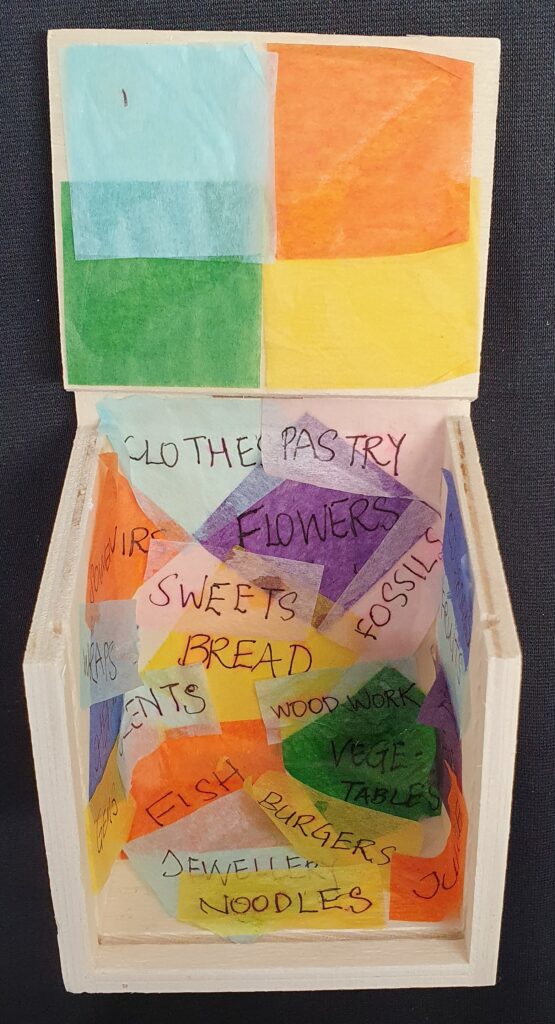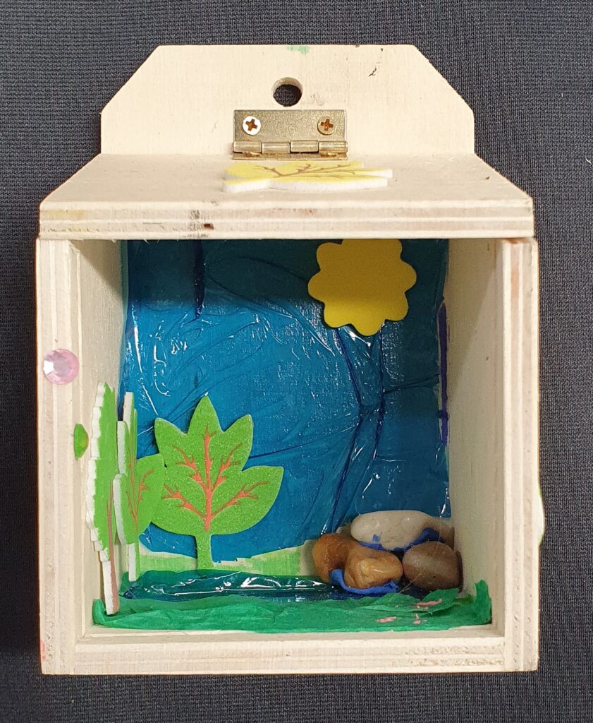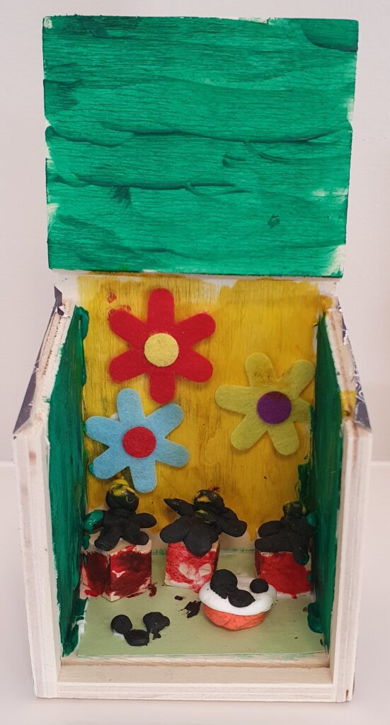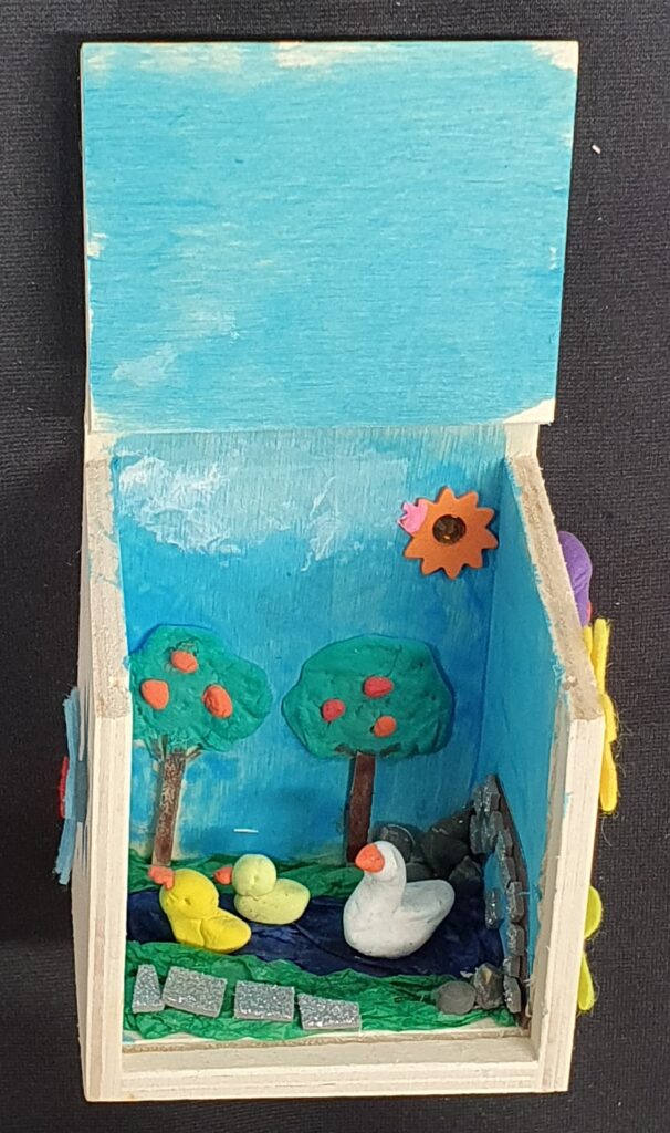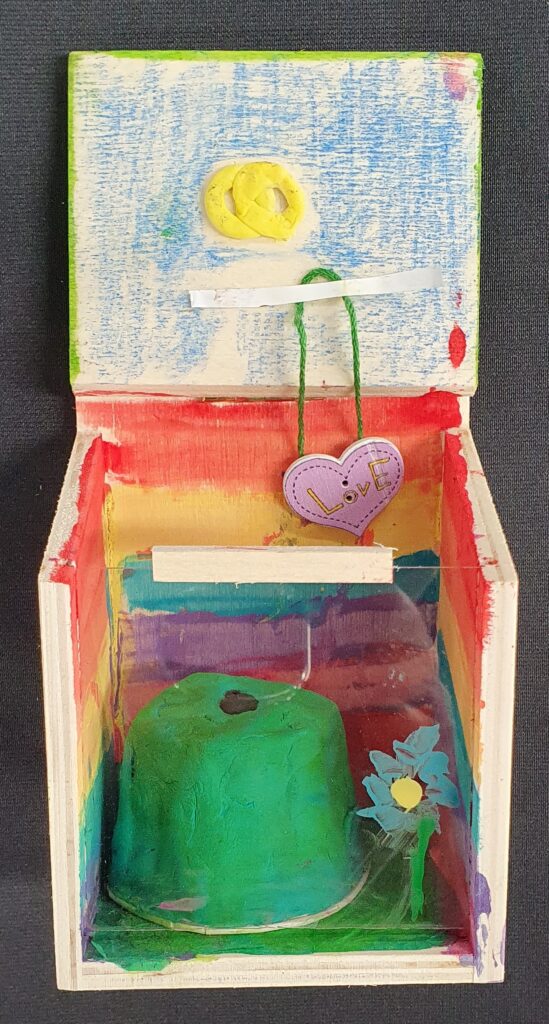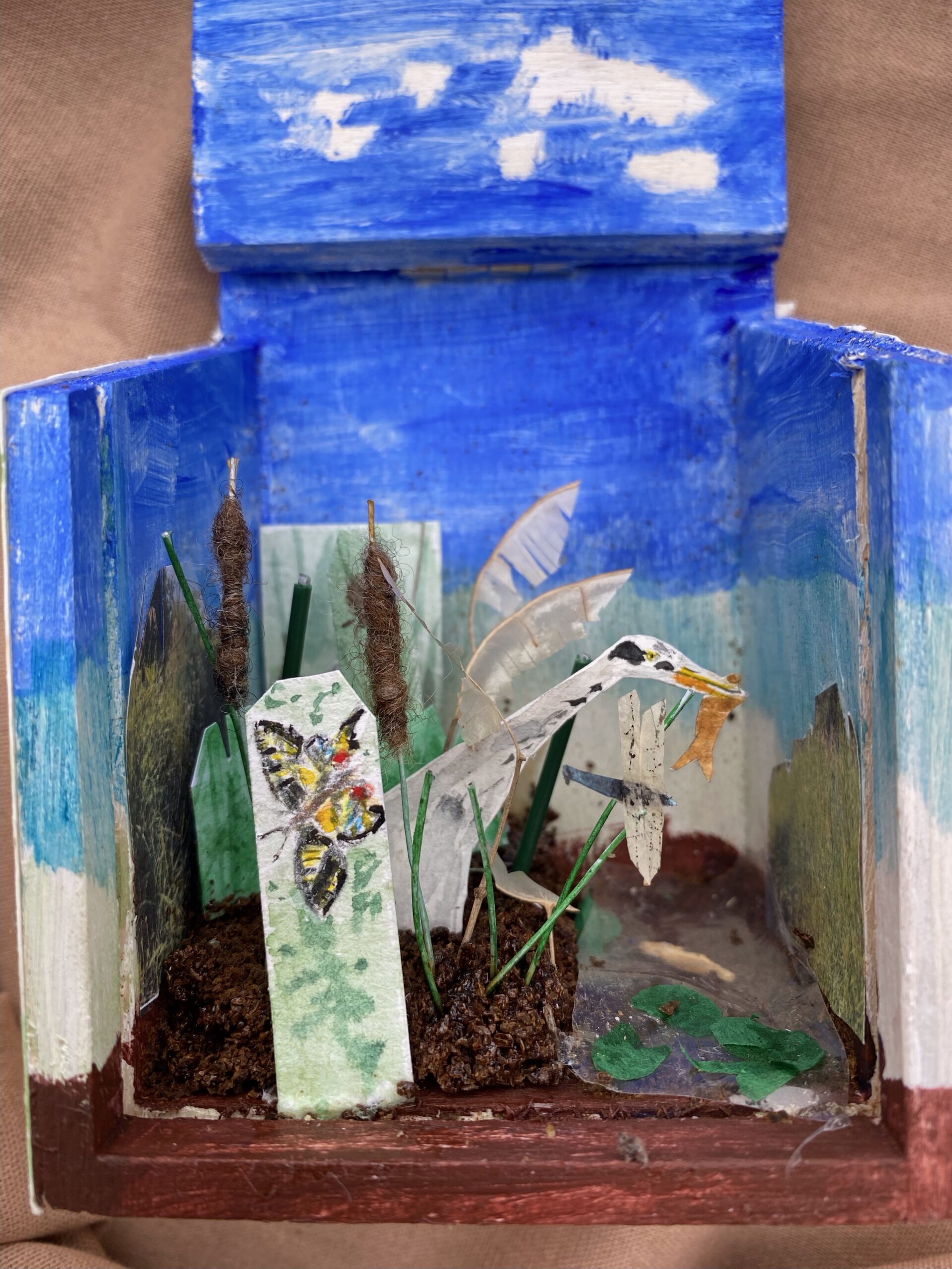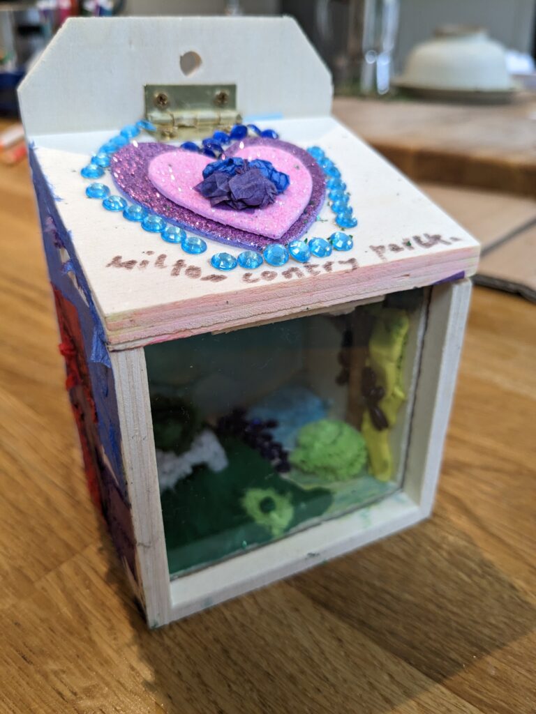 “I chose the beautiful Fens with amazing sunsets, as my subject. I hope to depict the drainage of the fens that started with draining Whittlesey mere. Then the shrinkage of the peat. Marked with the Holme post at Holme Fen. In the middle of the box is Rothschild’s bungalow that is in the beautiful Woodwalton fen. Charles Rothschild and his daughter spent a lot of time there studying wildlife. The bungalow is on stilts and the post on the lid show the soil and water levels over different years.”