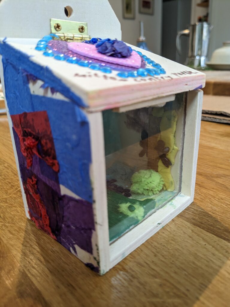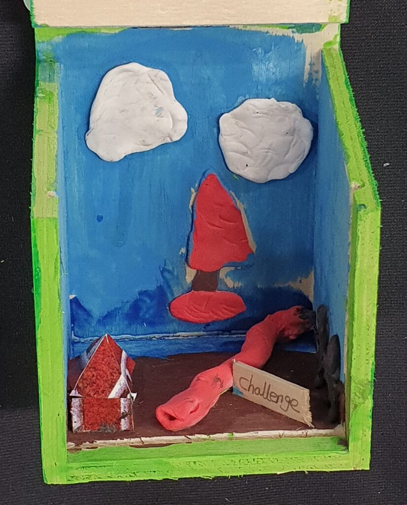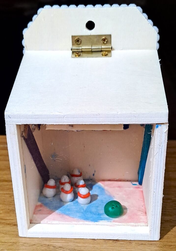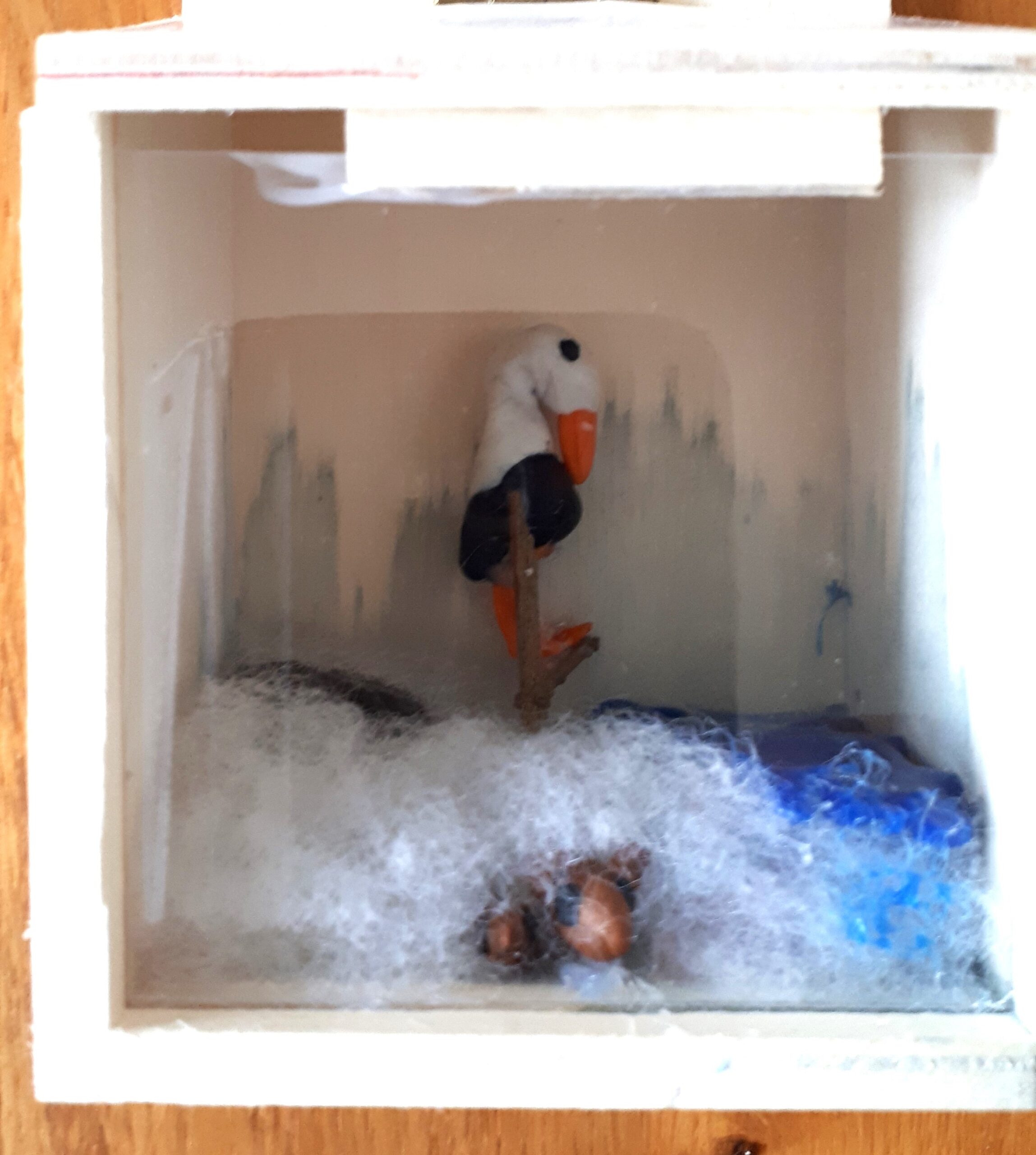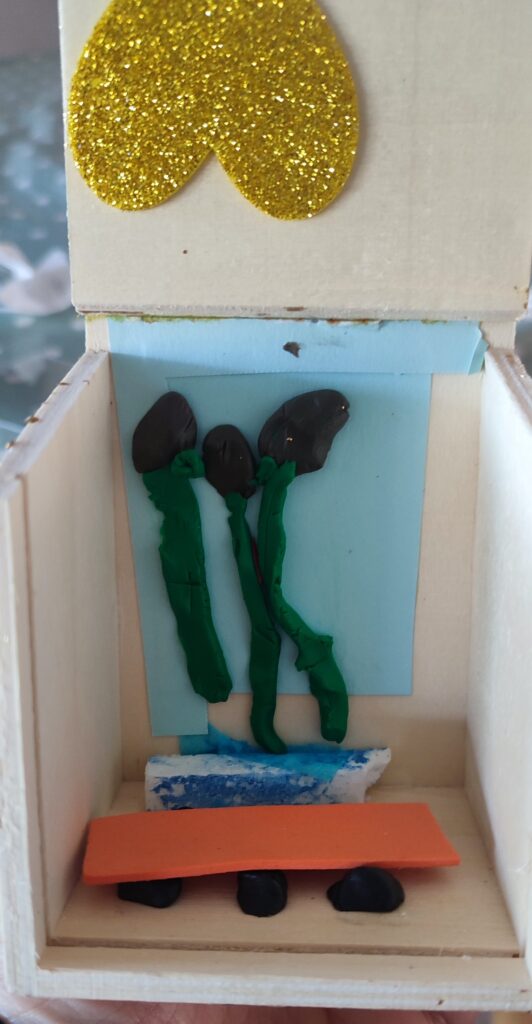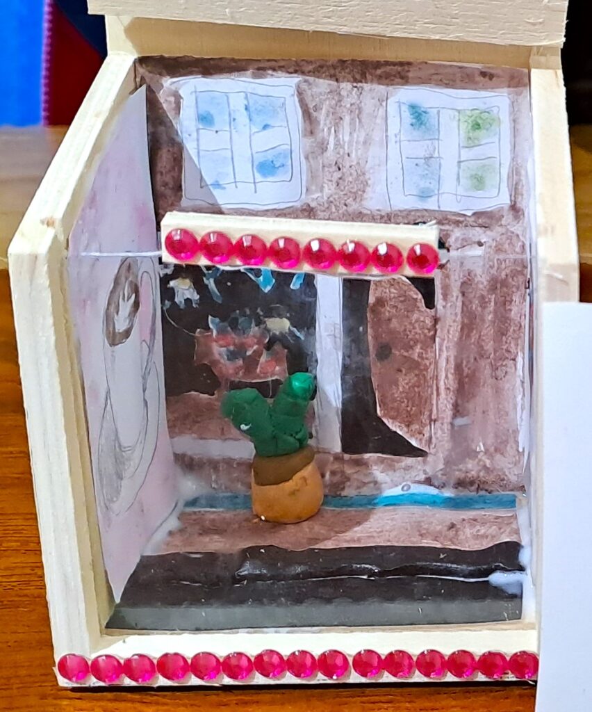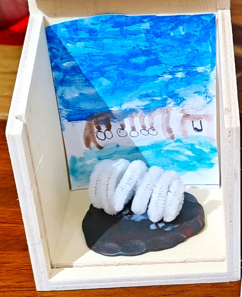 “I chose the beautiful Fens with amazing sunsets, as my subject. I hope to depict the drainage of the fens that started with draining Whittlesey mere. Then the shrinkage of the peat. Marked with the Holme post at Holme Fen. In the middle of the box is Rothschild’s bungalow that is in the beautiful Woodwalton fen. Charles Rothschild and his daughter spent a lot of time there studying wildlife. The bungalow is on stilts and the post on the lid show the soil and water levels over different years.”
