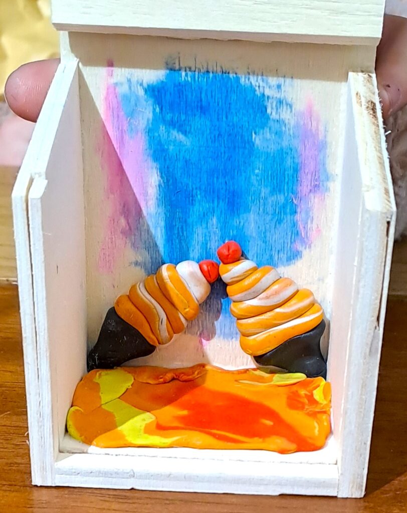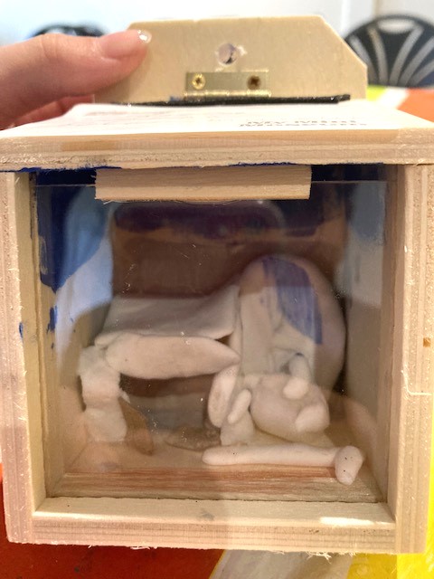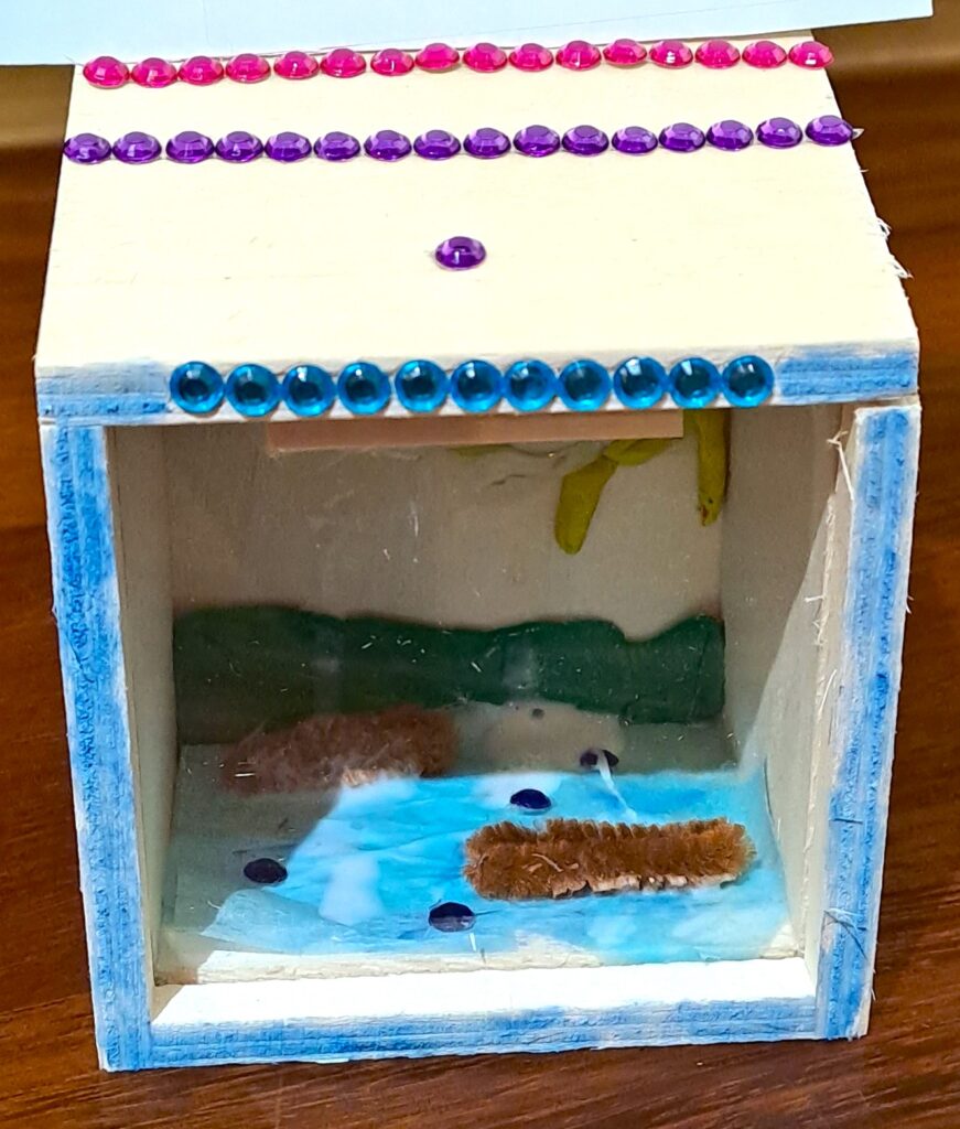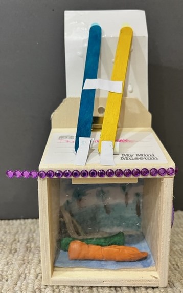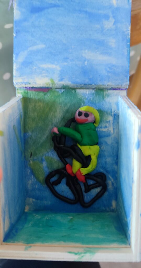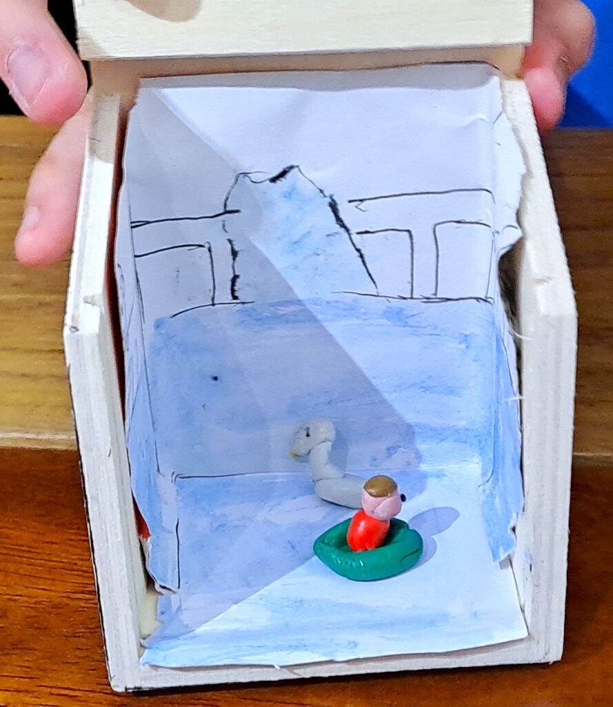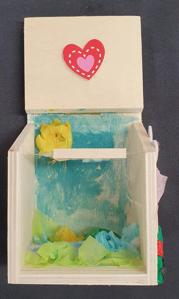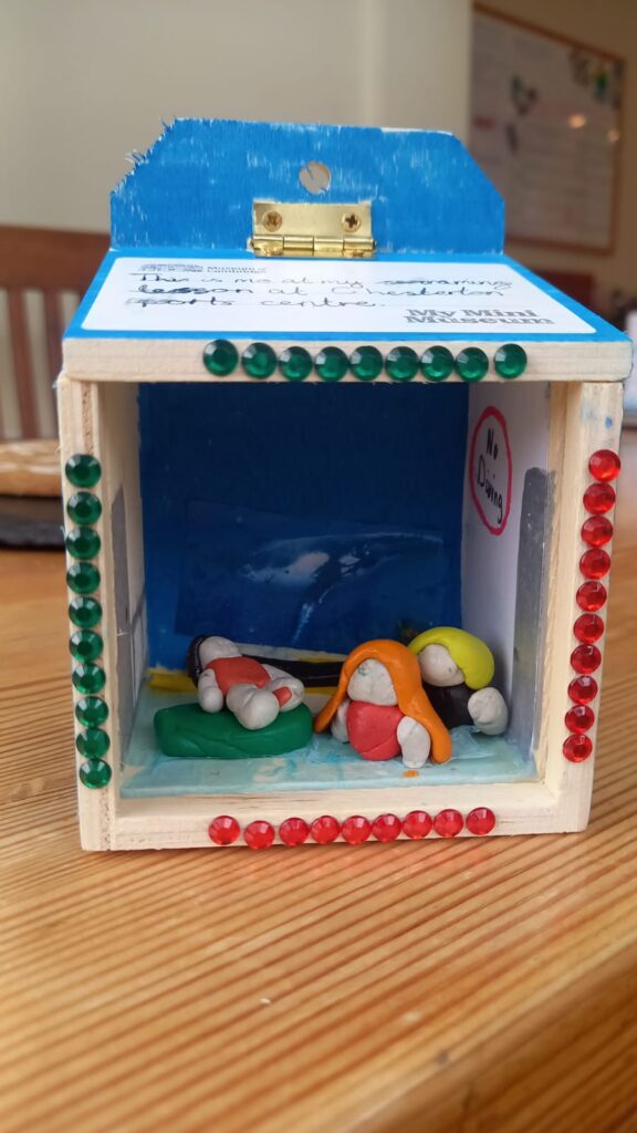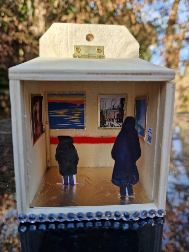 “I chose the beautiful Fens with amazing sunsets, as my subject. I hope to depict the drainage of the fens that started with draining Whittlesey mere. Then the shrinkage of the peat. Marked with the Holme post at Holme Fen. In the middle of the box is Rothschild’s bungalow that is in the beautiful Woodwalton fen. Charles Rothschild and his daughter spent a lot of time there studying wildlife. The bungalow is on stilts and the post on the lid show the soil and water levels over different years.”