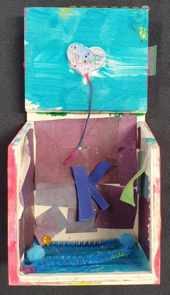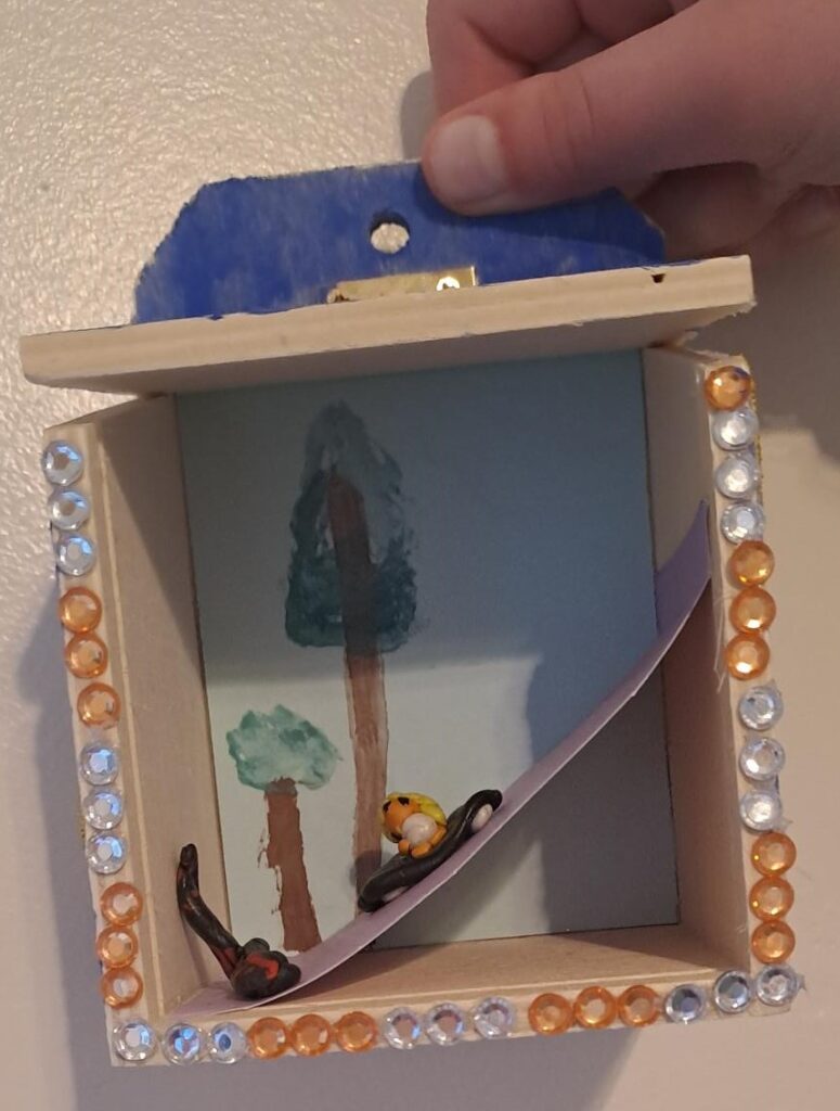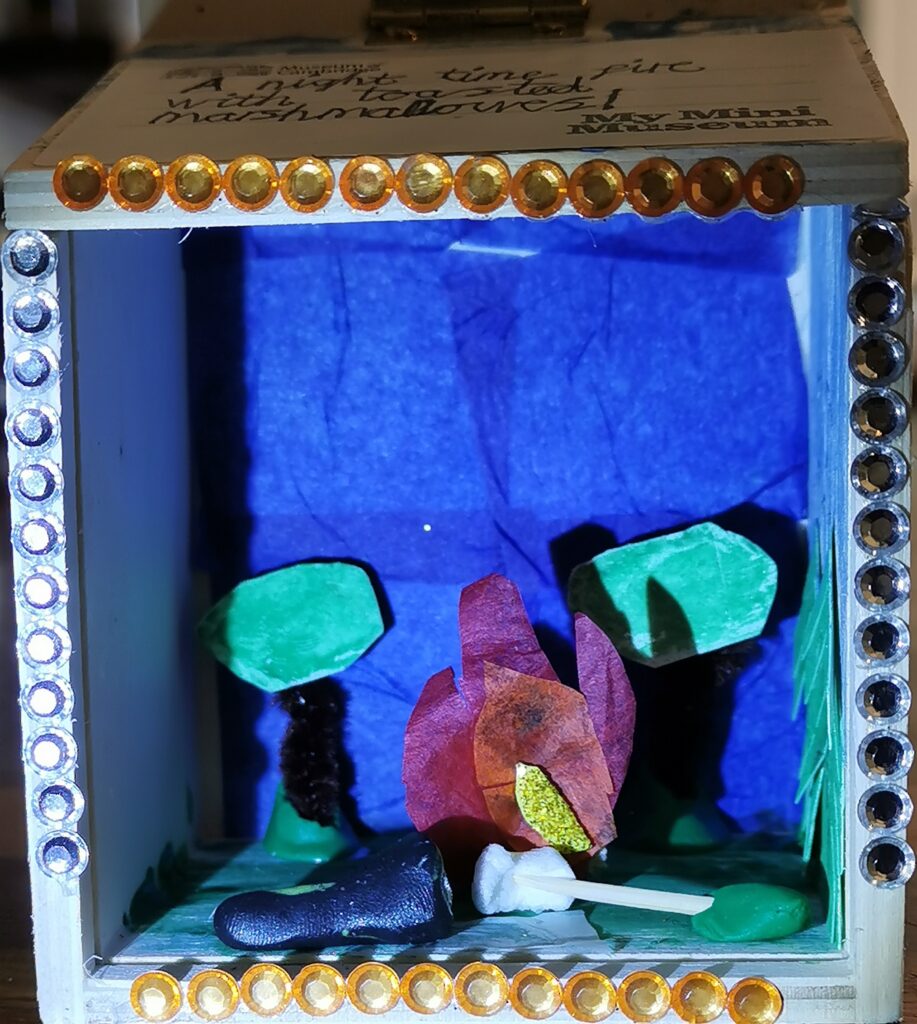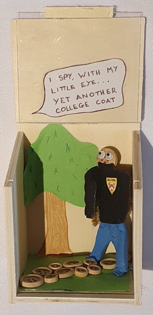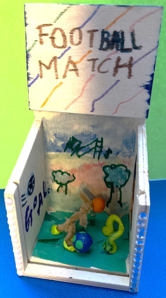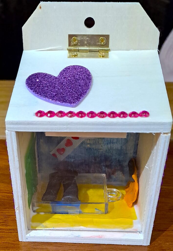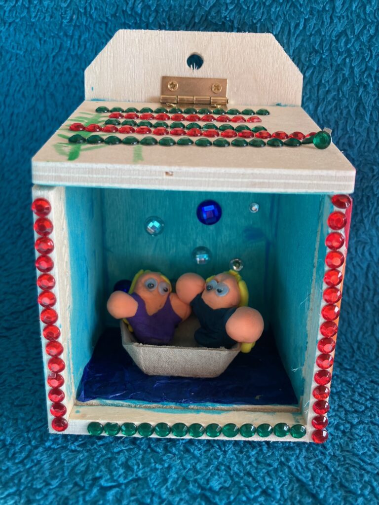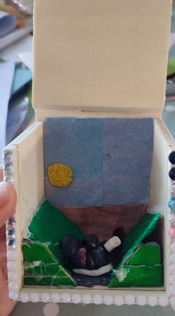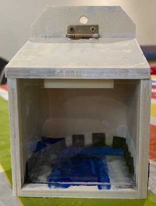 “I chose the beautiful Fens with amazing sunsets, as my subject. I hope to depict the drainage of the fens that started with draining Whittlesey mere. Then the shrinkage of the peat. Marked with the Holme post at Holme Fen. In the middle of the box is Rothschild’s bungalow that is in the beautiful Woodwalton fen. Charles Rothschild and his daughter spent a lot of time there studying wildlife. The bungalow is on stilts and the post on the lid show the soil and water levels over different years.”