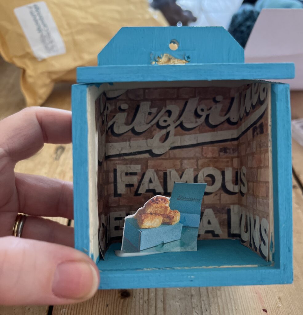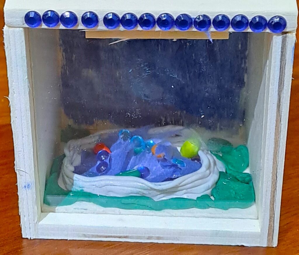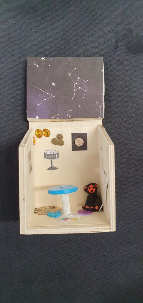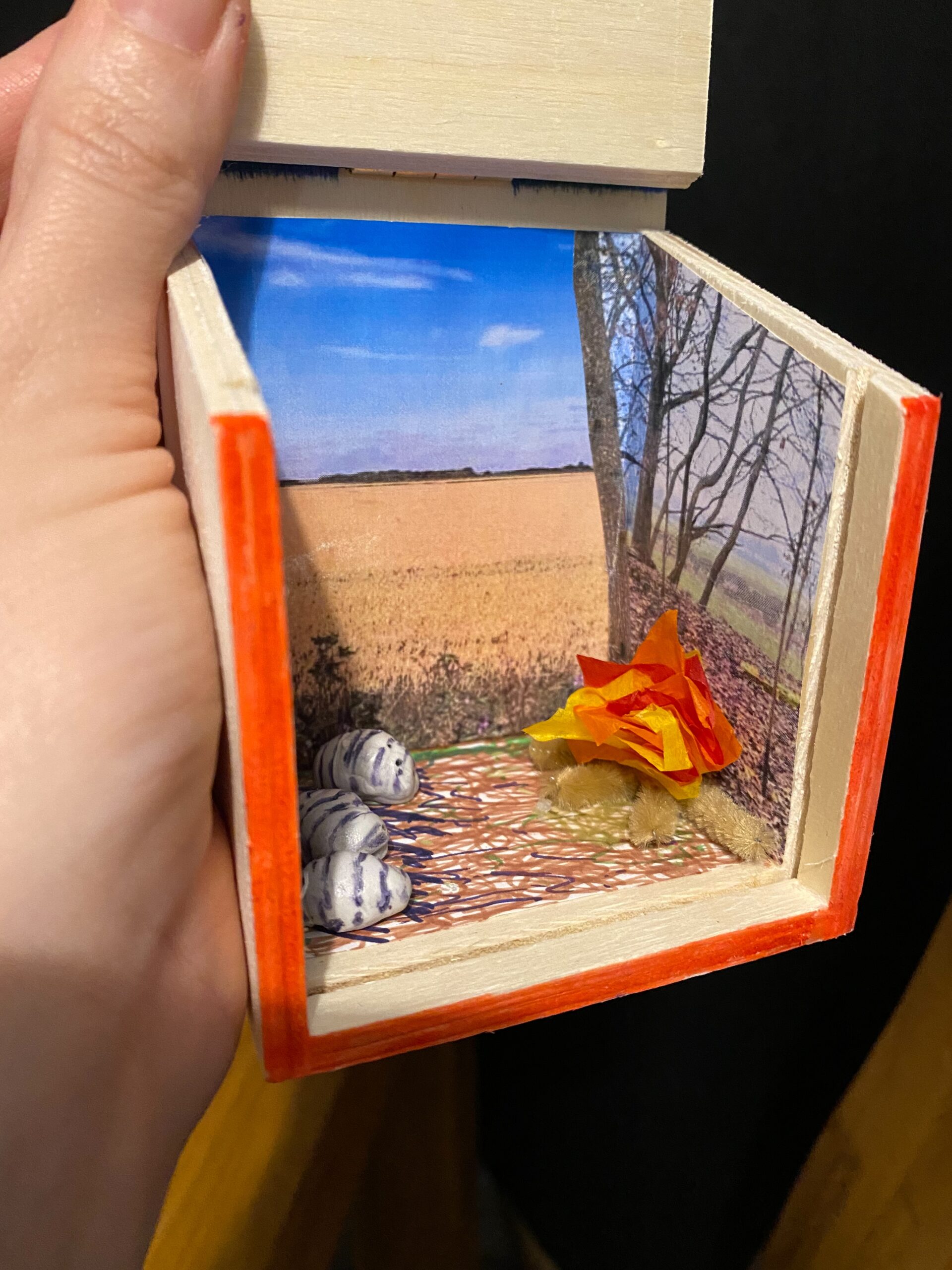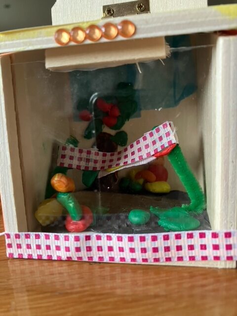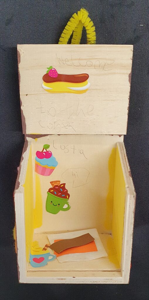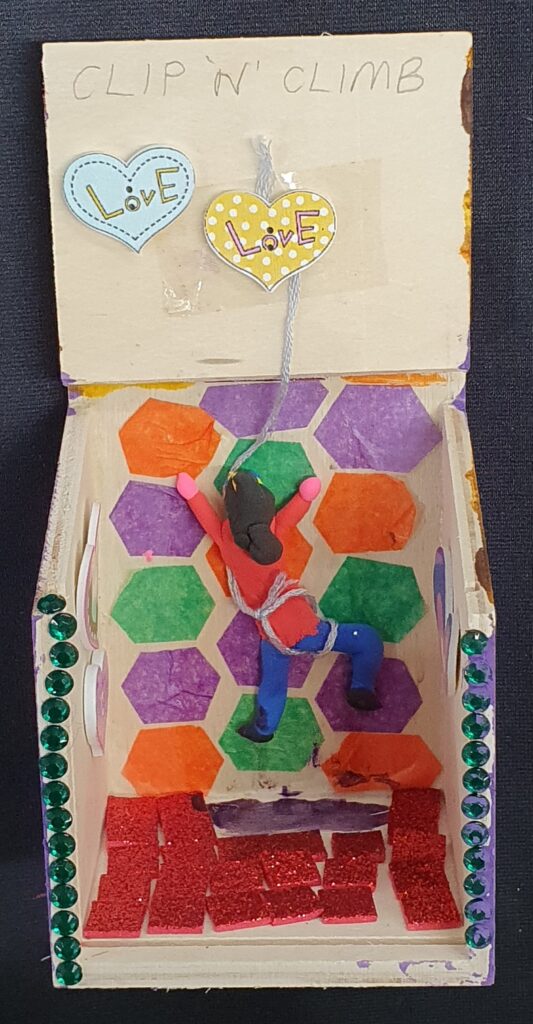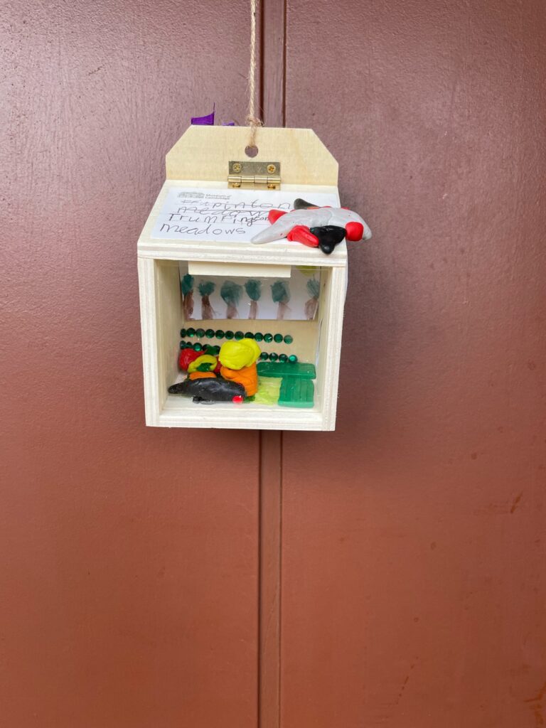 “I chose the beautiful Fens with amazing sunsets, as my subject. I hope to depict the drainage of the fens that started with draining Whittlesey mere. Then the shrinkage of the peat. Marked with the Holme post at Holme Fen. In the middle of the box is Rothschild’s bungalow that is in the beautiful Woodwalton fen. Charles Rothschild and his daughter spent a lot of time there studying wildlife. The bungalow is on stilts and the post on the lid show the soil and water levels over different years.”