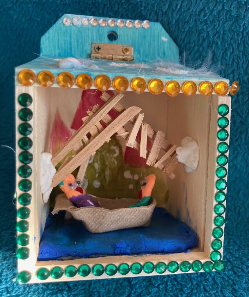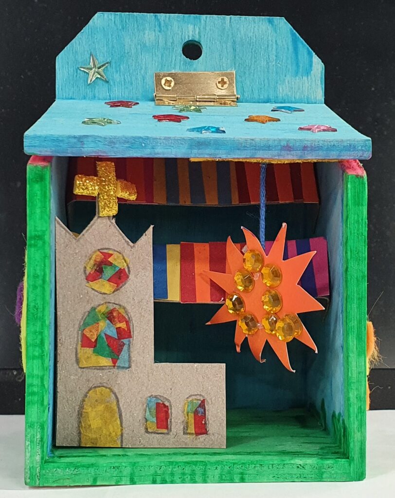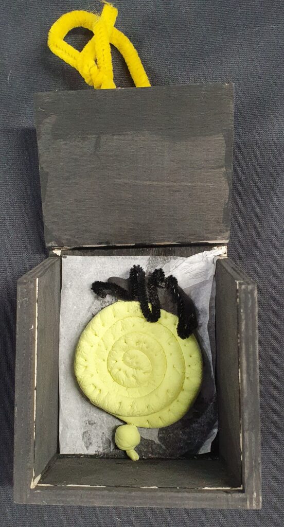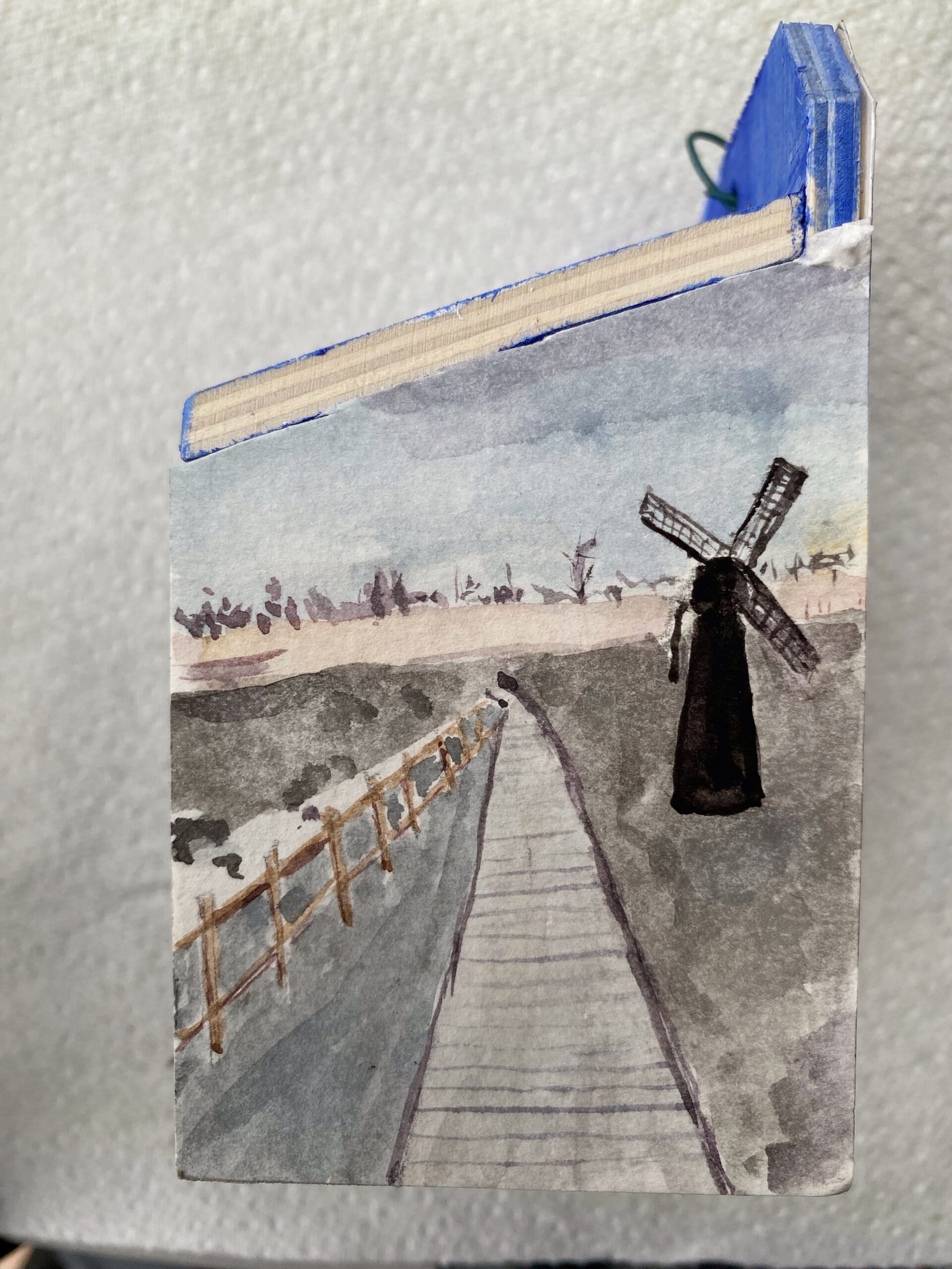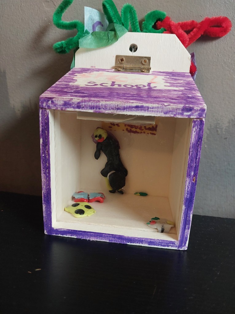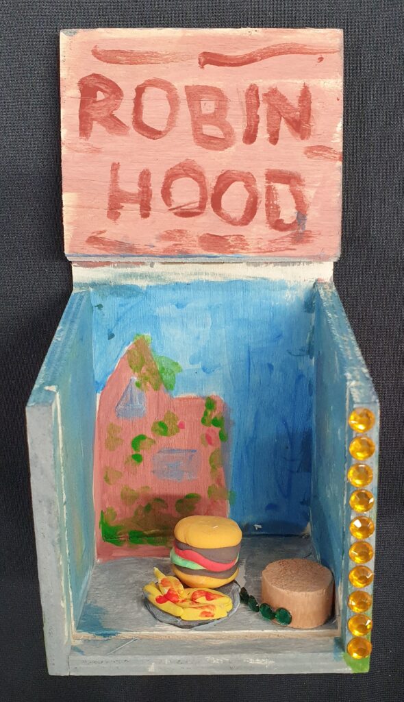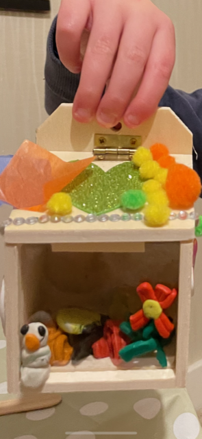 “I chose the beautiful Fens with amazing sunsets, as my subject. I hope to depict the drainage of the fens that started with draining Whittlesey mere. Then the shrinkage of the peat. Marked with the Holme post at Holme Fen. In the middle of the box is Rothschild’s bungalow that is in the beautiful Woodwalton fen. Charles Rothschild and his daughter spent a lot of time there studying wildlife. The bungalow is on stilts and the post on the lid show the soil and water levels over different years.”