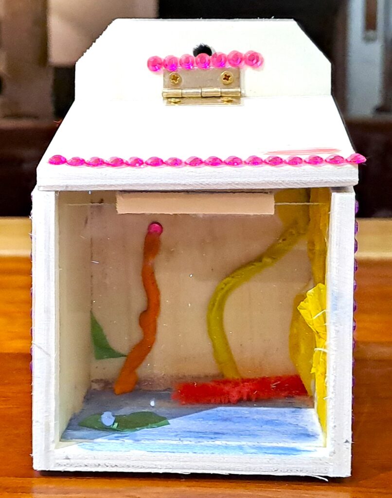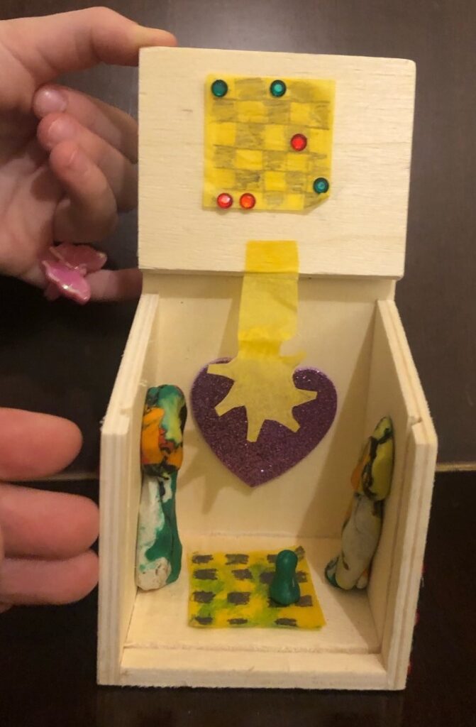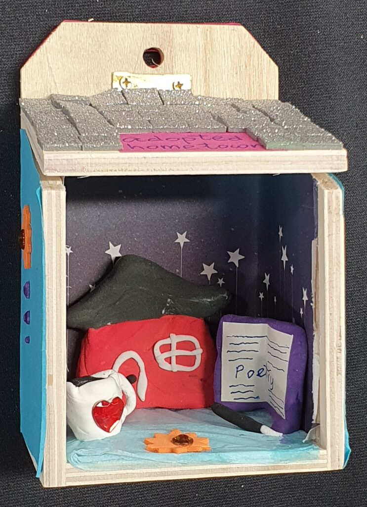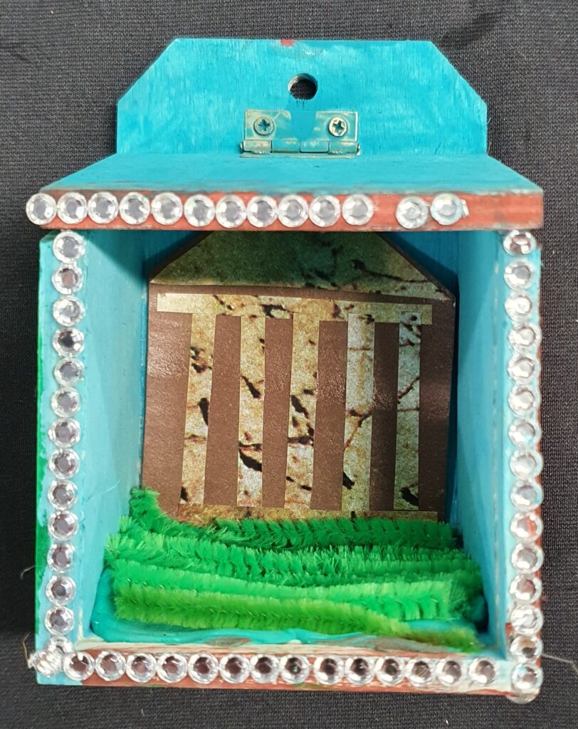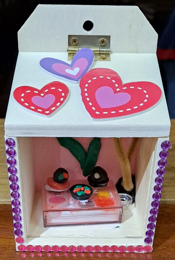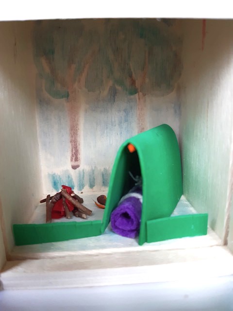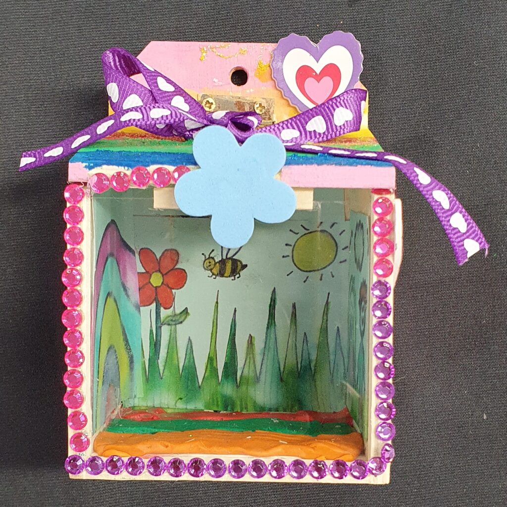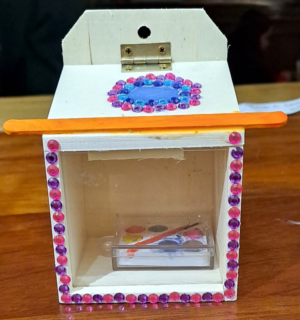 “I chose the beautiful Fens with amazing sunsets, as my subject. I hope to depict the drainage of the fens that started with draining Whittlesey mere. Then the shrinkage of the peat. Marked with the Holme post at Holme Fen. In the middle of the box is Rothschild’s bungalow that is in the beautiful Woodwalton fen. Charles Rothschild and his daughter spent a lot of time there studying wildlife. The bungalow is on stilts and the post on the lid show the soil and water levels over different years.”