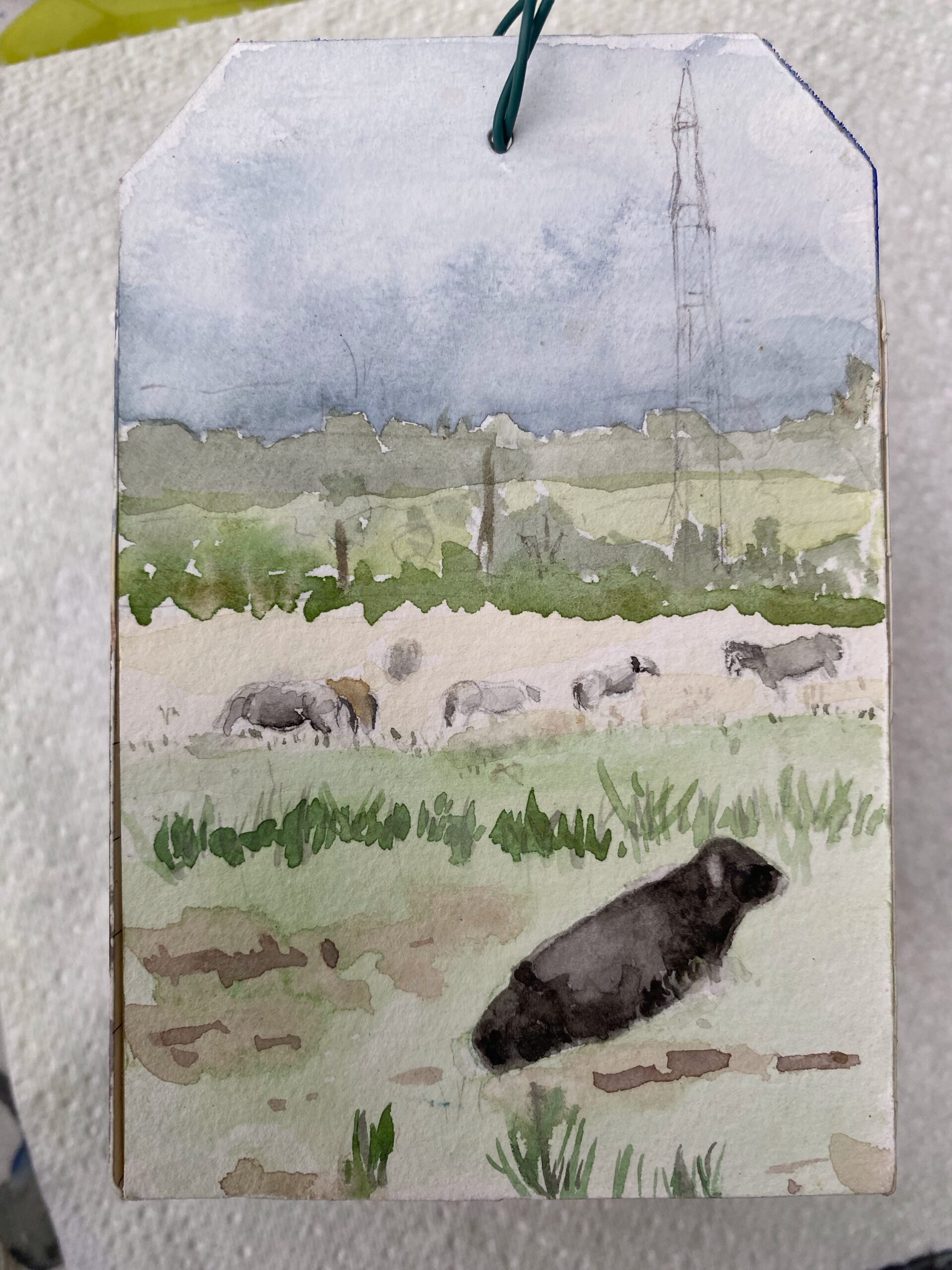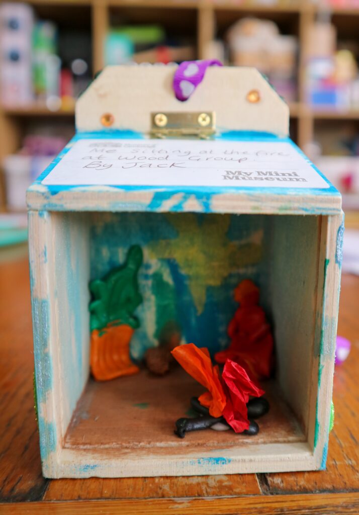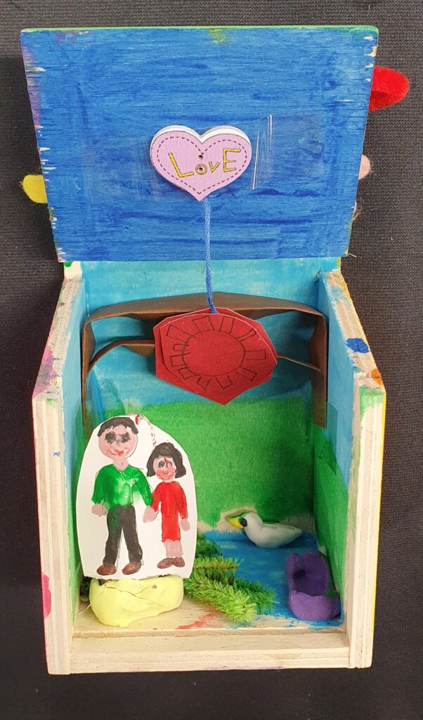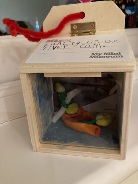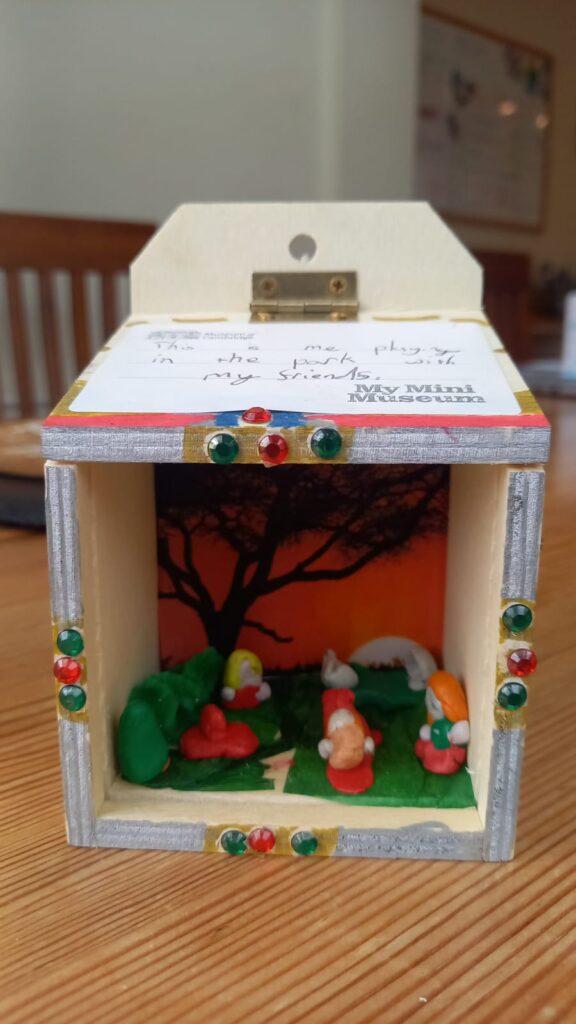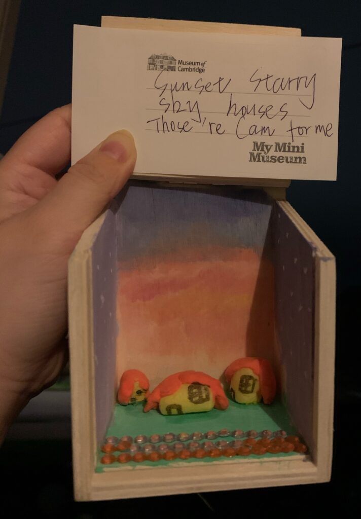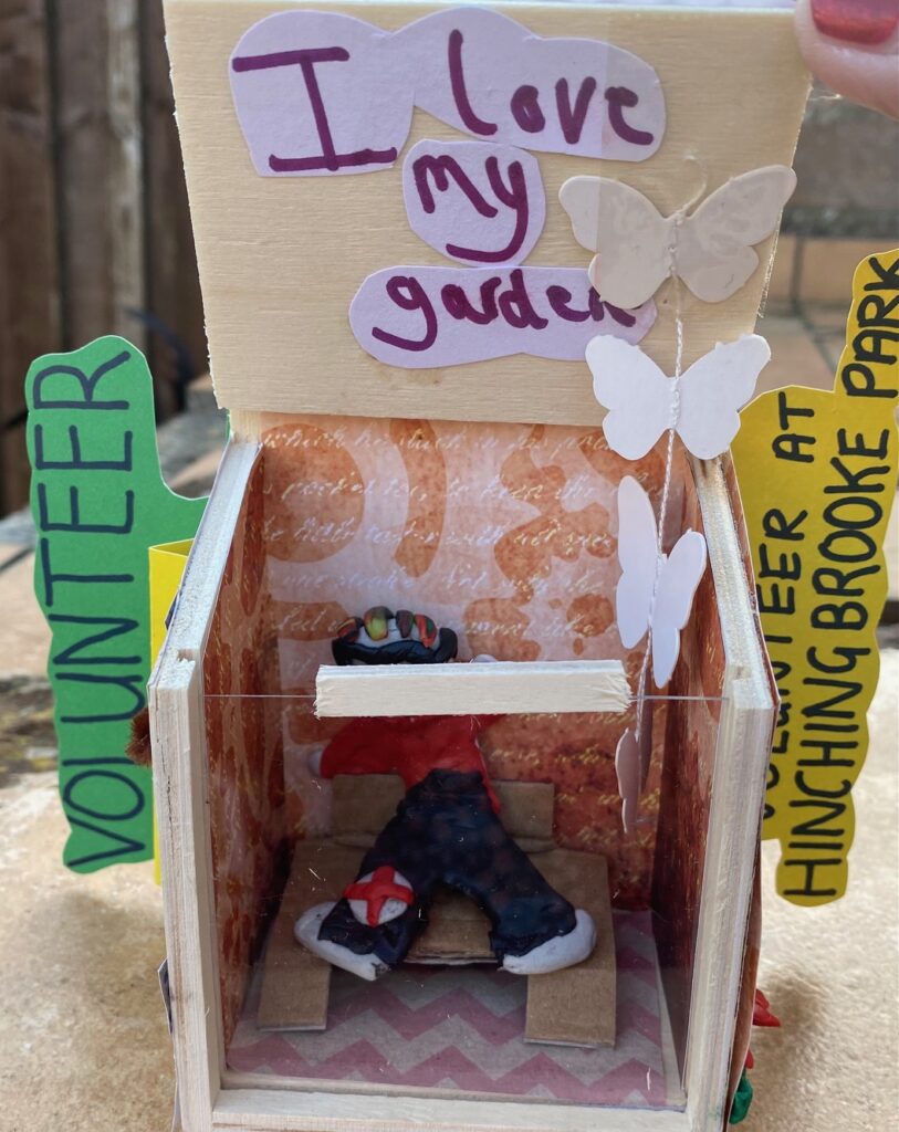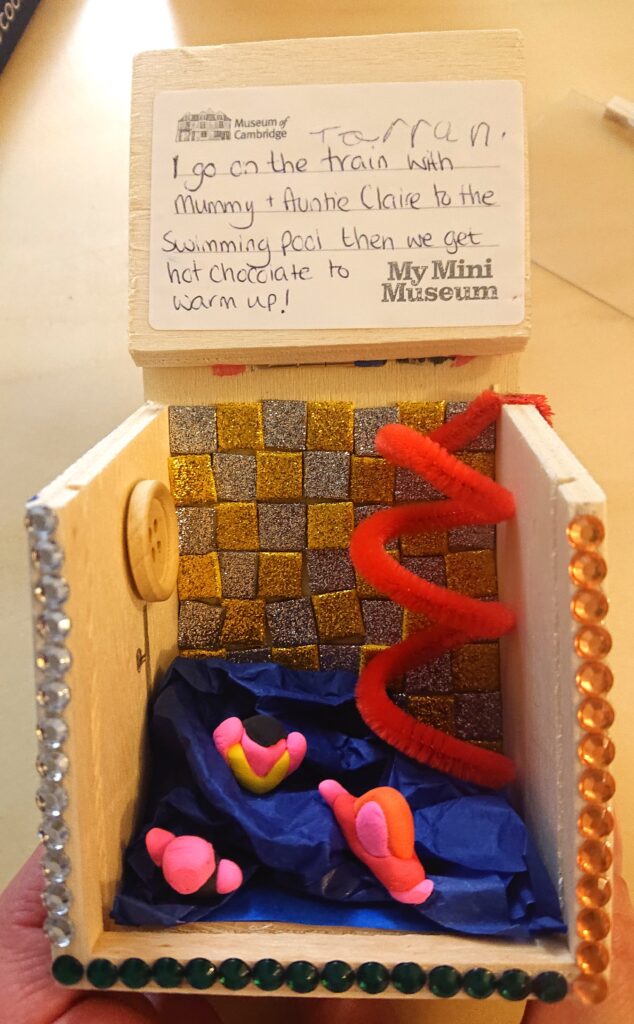 “I love my garden, the snowman we built last winter and crafting!”“A nighttime fire with marshmallows in our garden.”“I love punting on the Cam and the Mathematical Bridge.”“It represents the Fitzwilliam Museum, which is one of my favourite places to experience art, but amongst some of its famous works I have placed one of my own – maybe one day that could happen for real.”“I love my garden and volunteering at Hinchingbrooke Park.”“I go on the train with Mummy and Auntie Claire to the swimming pool, then we get a hot chocolate to warm up.”“Two figures playing with sticks at Wandlebury.”“The Museum of Zoology, with rhino skeleton, pangolin and some butterflies!”“My swimming pool where I can see the sunset.”“I love wildlife habitat!”“I love the River Cam, with swans and rowing boats.”