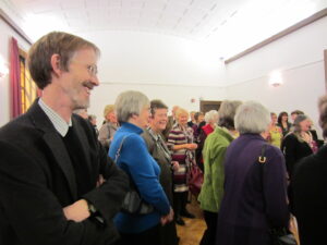 I first came across him when he was wheeling his street sweepers’ barrow out from the store behind my then office (I was Tourist Officer for the City Council) in Parson’s Court. He commented later that I always smiled at him. Perhaps because he somehow didn’t look like the stereotype of road sweeper. I was very pleased when he signed up to train as a Tour Guide (because, he said, he was already directing tourists, and he might as well be paid for it). I learnt then that he was really a historian (History degree from Sheffield). We then both undertook the 3 year Madingley Certificate of Local History course so I got to know more about his interests, though not as much as I have heard more recently from his own biographical film.
